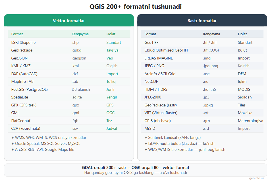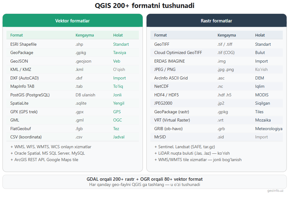 QGIS ning eng katta afzalliklaridan biri — son-sanoqsiz ma'lumot formatlarini tushunish qobiliyati. GDAL kutubxonasi orqali 200 dan ortiq rastr formatni, OGR orqali 80 dan ortiq vektor formatni ochish va ularning ko'pchiligiga yozish mumkin. Bu degani, boshqa dasturlarda yaratilgan deyarli har qanday geo-faylni QGIS ga surtmasdan tashlash va bilan ishlash mumkin.